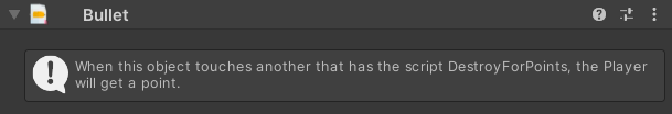 Finally, the ObjectShooter script also has the ability to assign a player ID to the projectiles. This works in conjunction with the BulletAttribute script (referenced below), which needs to be assigned to the projectile prefab that you want to shoot out. Doing so means that if the projectile hits another object that has the DestroyForPointsAttribute script (referenced below), points are assigned to the correct player.