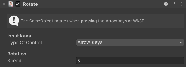 The Rotate script applies a torque - that is, a rotation on the Z axis, to an object. Like the Move script, this movement is controlled with the arrows keys or WASD keys. You can use a Rotate script together with a Push script to create a vehicle-like controller, where you can steer and move forward in the direction the vehicle is pointing in.