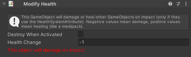The ModifyHealthAttribute script makes any object capable of subtracting or adding health to any object that has the HealthSystemAttribute script. This script is useful for projectiles, hazard zones, and other damaging objects, but can also be used for things that can heal, like medical kits, food, and more!