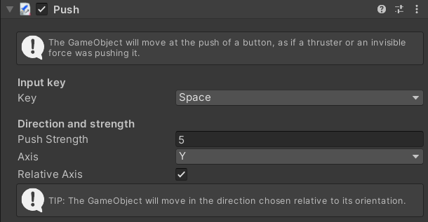 In conjunction with Axis, the Relative Axis property controls whether the push rotates with the GameObject or whether it is applied in absolute terms. For example, with Relative Axis enabled, rotating the object by 90 degrees clockwise also rotates the relative direction of the push by 90 degrees clockwise. With Relative Axis disabled, the direction of the push stays the same, no matter how the object is moved. There is no change in the gizmo if the object has no rotation.