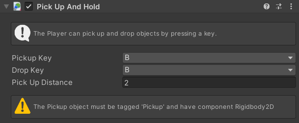 To be able to pick up an object, you need to assign that object the Pickup tag and give it a Collider2D component of any kind. You’ll also probably want to make the Collider a trigger, otherwise the object collides with the player and is harder to pick up. If the object has a Rigidbody2D component, it is made kinematic and any forces are stopped before being parented to the character.