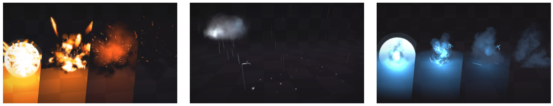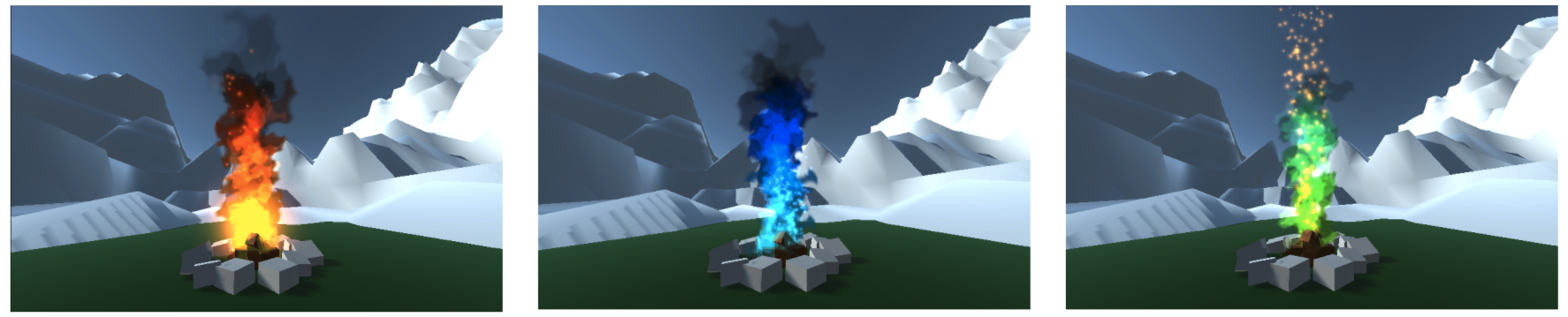 Unity features a robust Particle System where you can simulate moving liquids, smoke, clouds, flames, magic spells, and a whole slew of other effects.