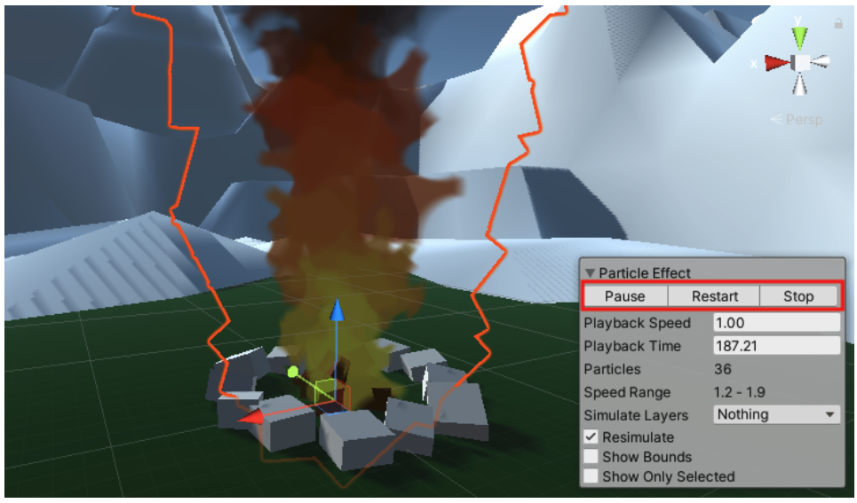 2. In the Particle Effect menu on the right side of the Scene view, click the Pause, Play, Stop, and Restart buttons to control the fire.