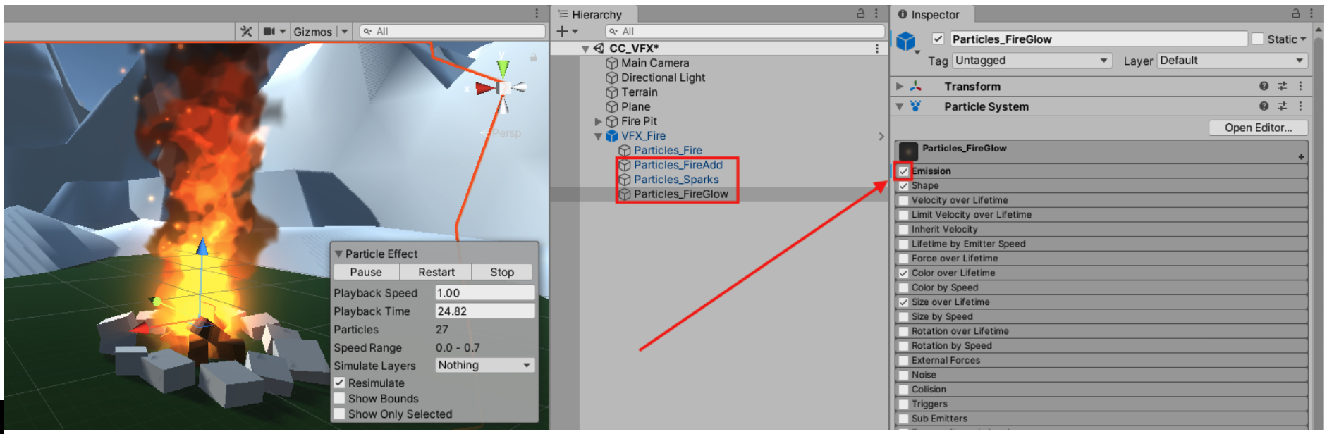 1. In the Hierarchy, select VFX Fire > Particles_Sparks.