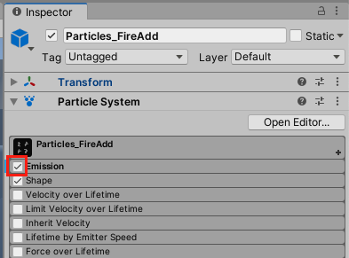 2. Select the Particles_FireAdd object, then locate and enable the Emission module of the Particle System component. Notice the impact it has on the fire. The Emission module controls how many particles are emitted from a system.