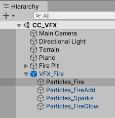 1. In the Hierarchy, expand the VFX_Fire object to reveal the four individual child Particle Systems that make up the fire. Currently, only the Particles_Fire object is emitting particles.