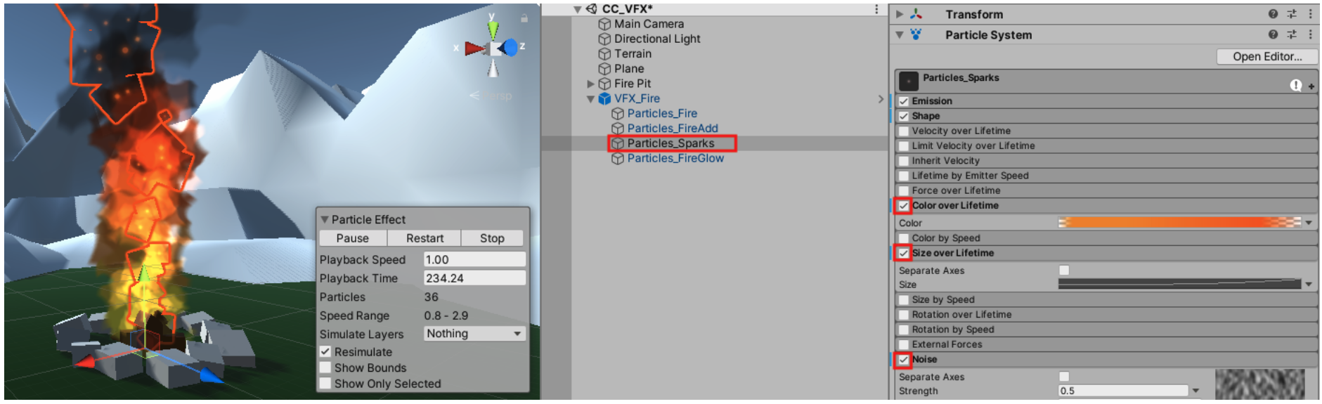 Right now, the sparks from the fire are very simplistic. To change the way a particle system looks or behaves, you need to enable and edit its Modules. A Particle System is made up of many different Modules, each controlling a different aspect of the particle (e.g. its color, size, velocity, etc).