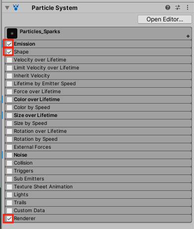 - Notice that the only modules currently enabled are Emission, Shape, and Renderer. These are the modules enabled by default on all Particle Systems.