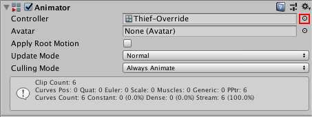 1.  Inspector で、Animator コンポーネントを見つけます。