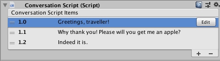 3.  Conversation Script Items リストで、Script Item 1.0(「旅人さん、こんにちは!」)を選択し、Edit をクリックします。