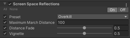 Screen Space Reflections are an easy way to depict wet, shiny, or mirrored surfaces. They’re commonly seen in science fiction art in the form of mirrored floors and rain puddles in wet asphalt. Screen Space Reflections are computationally expensive, so they’re a good fit for projects targeting desktop and console, but not mobile. They require the deferred rendering path, as they use the Normals G-Buffer. As a post-process effect, they’re automatically applied to smooth and metallic surfaces, controlled via Material properties.