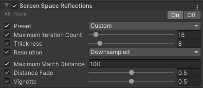 Resolution optionally modifies the size of the Screen Space Reflections buffer by downsampling for lower quality but faster performance, ideal for projects with more intense action or faster pace, or supersampling for higher quality but slower performance for projects where visual quality is more important.
