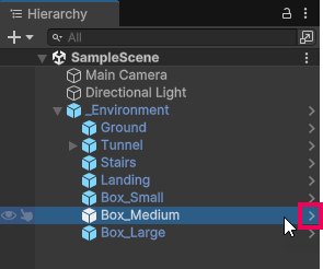 - In the Hierarchy window, select the right-arrow to the right of a prefab instance (as shown below).