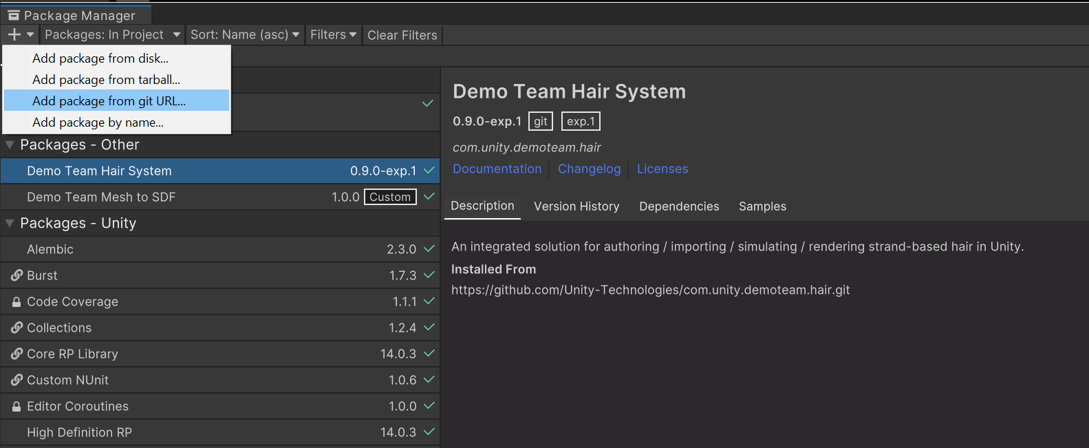 3. Use the URL: Unity-Technologies / com.unity.demoteam.hair.git