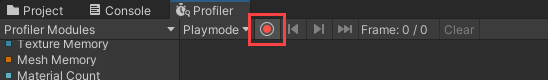 4. Currently, the Profiler is completely blank, because no data about the scene has been gathered yet. The Profiler begins working when you start Play mode. Ensure that the Profiler’s record button (the red dot) is active, and then press Play.