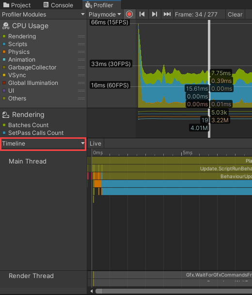 The bottom half of the Profiler shows a visual breakdown of exactly what’s occurring in each frame. If you don’t see the bar graph visualization on the bottom half of the Profiler, select Timeline in the dropdown directly below the Profiler Module section.