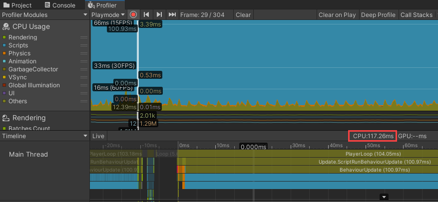The module contains a chart of various categories of operations and how they are making use of the CPU. On the left side of the module, there is a color key for these categories. Spikes show when one of these categories of operations, such as Rendering, takes up more time to work on a specific frame.