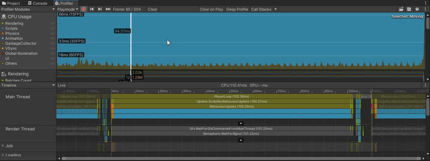 So, to reach a target of 60 FPS, each frame has a millisecond budget of 16. This means that the frame currently being profiled is more than seven times what it needs to be!