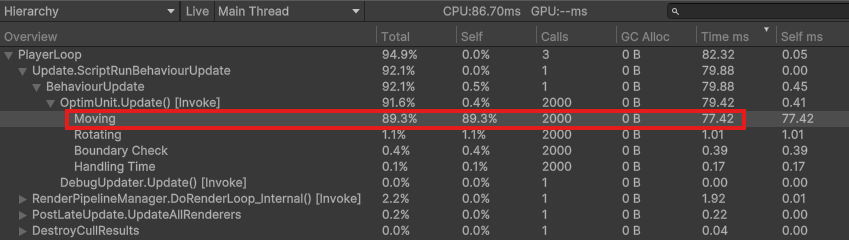 Click on the bar to see that the source of this action is the OptimUnit script, specifically its Update method. It takes 81.55 ms to complete, which by itself goes over our milliseconds budget many times over. Also note that there are 2,000 instances of this script running in this frame, which is significant because we know that we’re generating 2,000 forklifts in the OptimManager script. Somehow, these two factors must be related.
