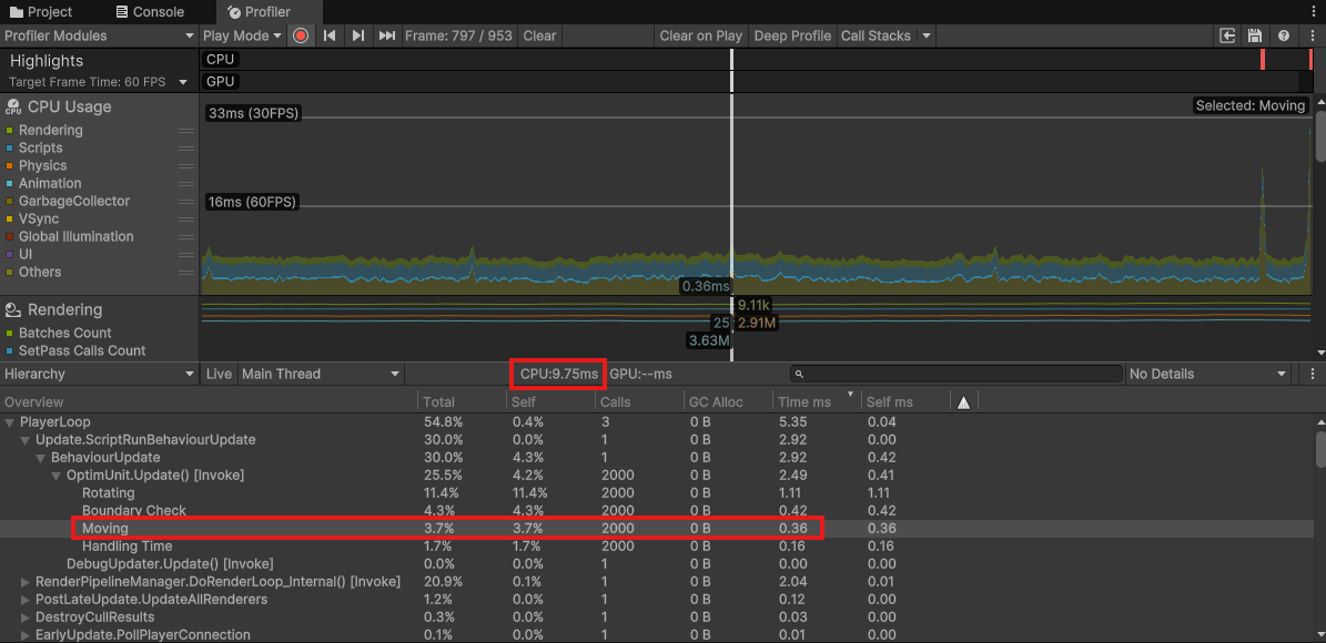The change in the Profiler is dramatic! Previously, the Move code was taking 77.42ms to complete. After the optimization changes, it only takes 0.36. The total CPU ms have also dropped to 9.75, which is beneath the 16 ms target!