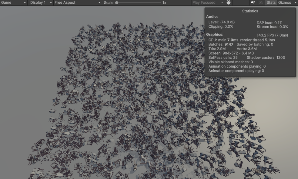4. In Play mode, thousands of forklifts appear on the plane, all rotating and moving around within a set boundary. Open the Stats tab and make note of the current frames per second (FPS) for your computer.