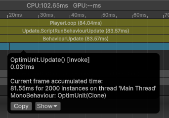 There’s a lot going on in the OptimUnit script Update method, so let’s get a little bit more help from the Profiler. We can profile specific sections of code by adding Profiler.BeginSample and Profiler.EndSample methods.