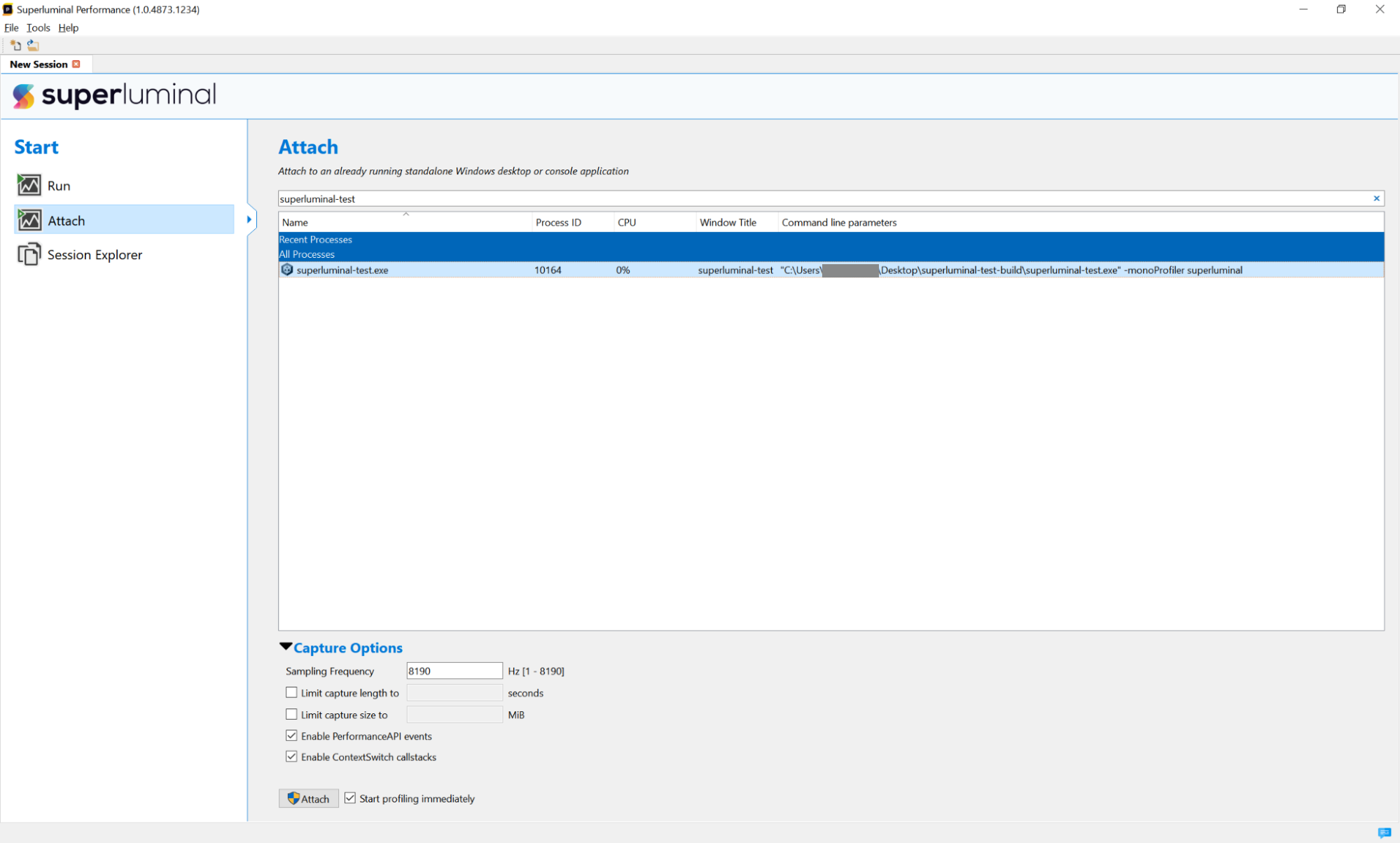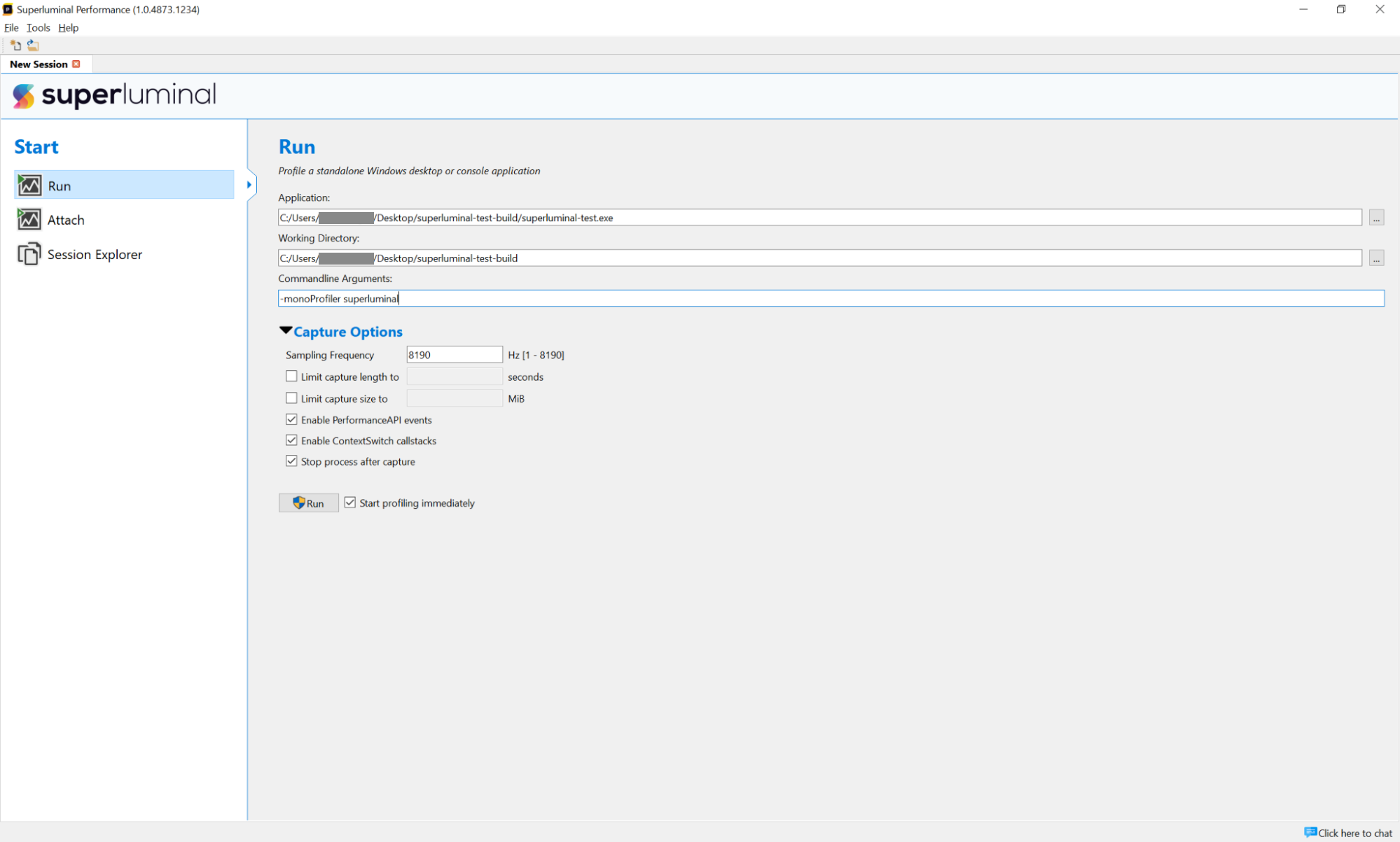 If you select Run, or Attach with the Start profiling immediately option disabled, Superluminal will not begin profiling the application immediately. You can: