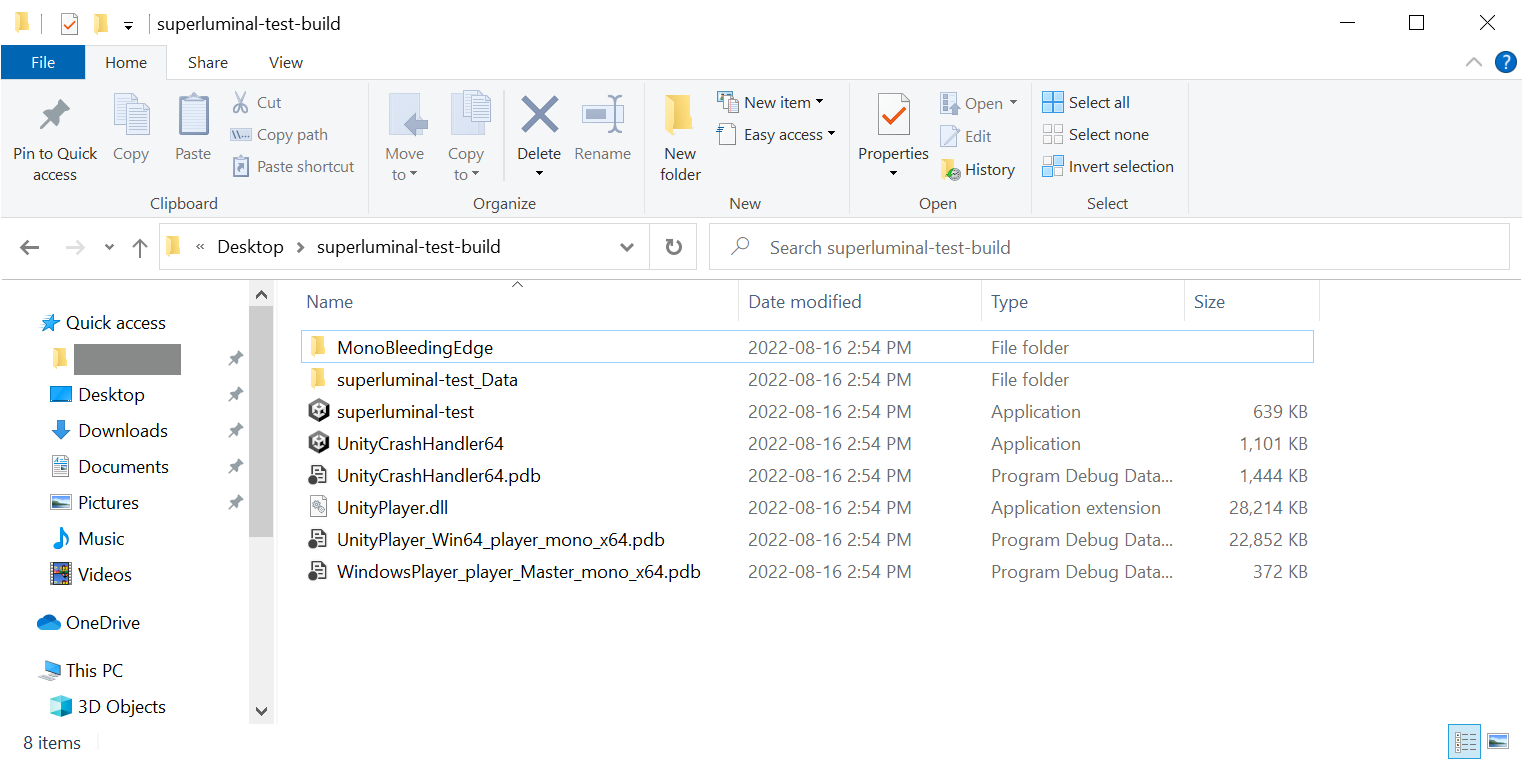 9. Select Build. Once this process is complete, you will have a folder containing your executable Windows Player on disk.