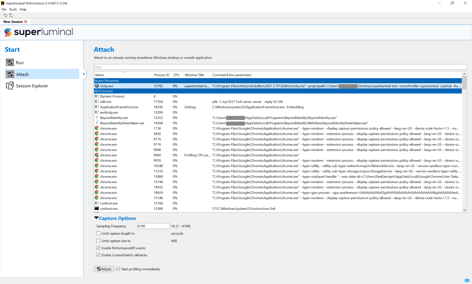 6. With the Unity Editor loading or running, open Superluminal. In the leftmost tab, select Attach and then select the Unity Editor from the list of available processes.