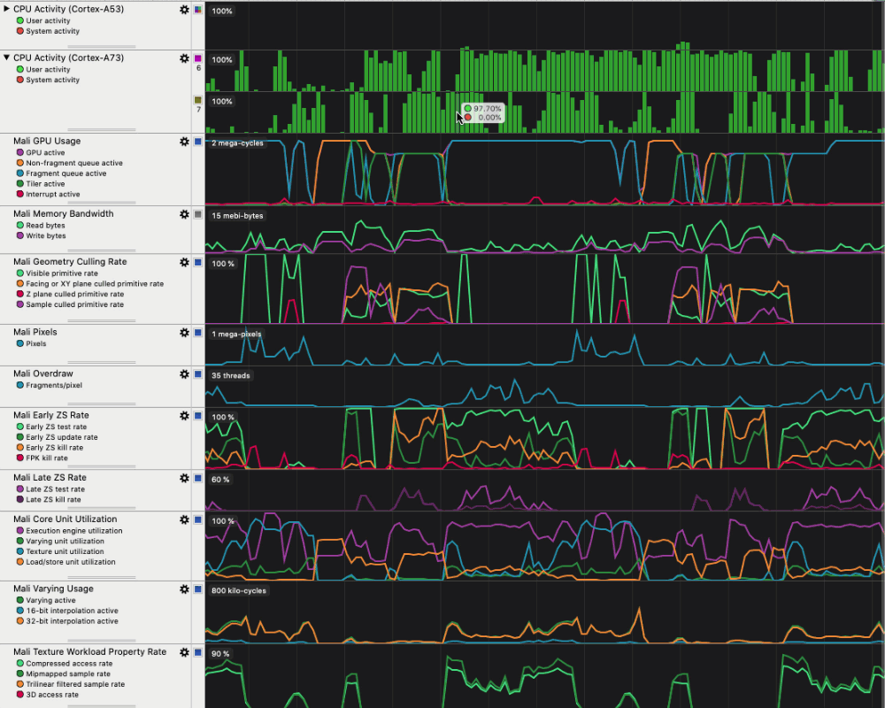 Streamline measures CPU activity to find areas where you can reduce usage and analyzes active GPU workloads in your mobile application’s problem areas. You can explore how the GPU handles triangles that were too small to be rendered, off-screen, or overdrawn. Streamline can also help you assess shader performance and texture usage.