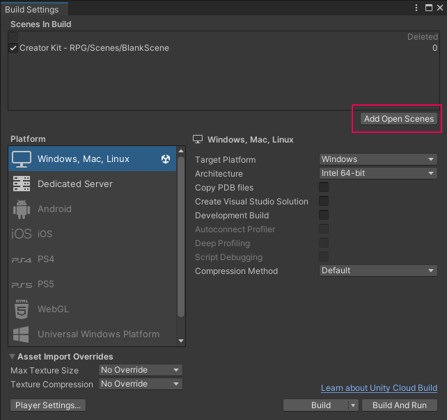 2. In the dialog window, select the Add Open Scenes button at the bottom of the empty Scenes In Build list. This will add the currently open Scene to the build.