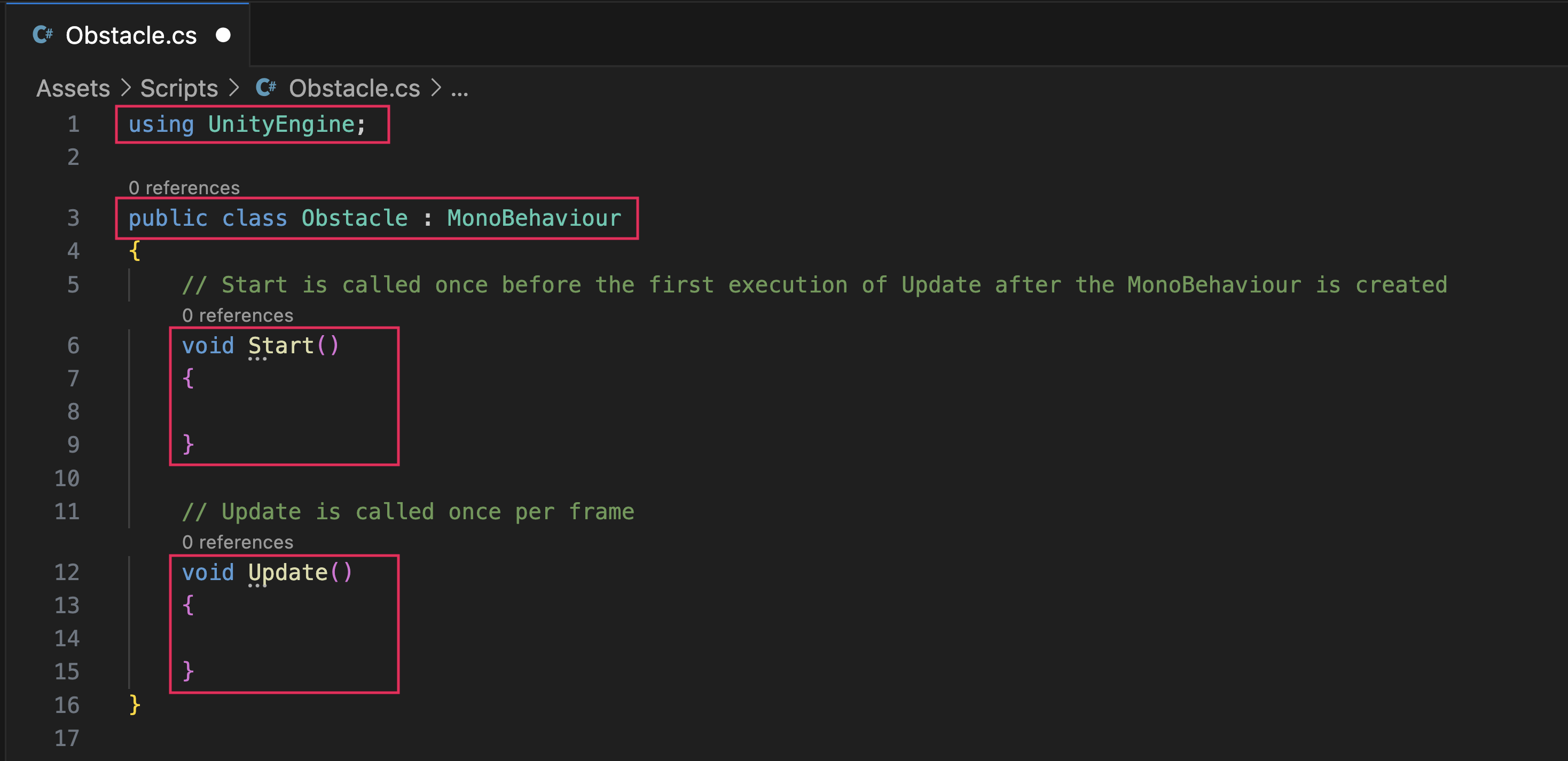 - Below that, you’ll see a class definition that matches your script’s name: public class Obstacle : MonoBehaviour.