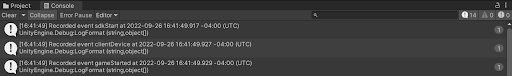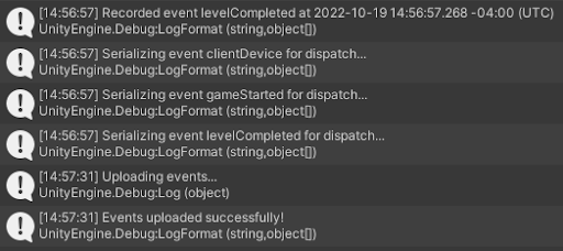By default, the Analytics SDK doesn’t log information about Analytics Events in the Editor Console, to ensure that it runs as efficiently as possible. However, you might want to enable logging for extra visibility while you experiment.