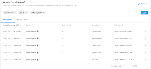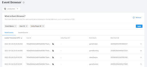 The Event Browser provides a quick way to check that your events are recorded and passing validation. If for any reason your events fail validation, you’ll be able to see the precise reasons on the Invalid Events tab. We will cover debugging and handling invalid events in the next tutorial.