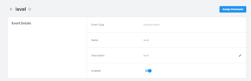 1. On the Dashboard, go to Analytics > Event Manager and select the levelCompleted custom event that you created previously. Select its name to open the view panel, then select Assign Parameter.