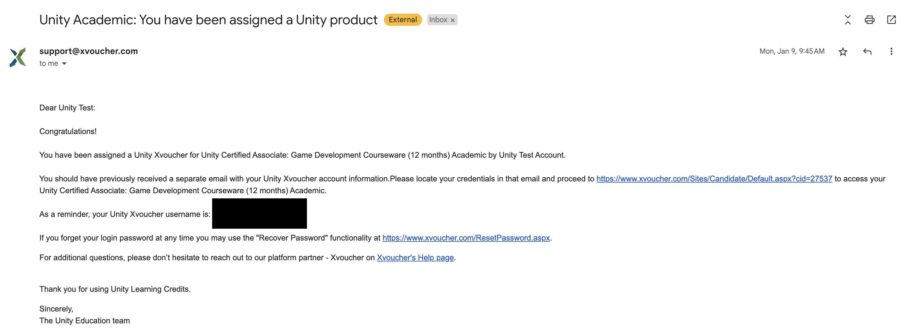 Once students/faculty have been assigned a Unity Education Product(s), they will receive this email invitation to access their Xvoucher account to get started.