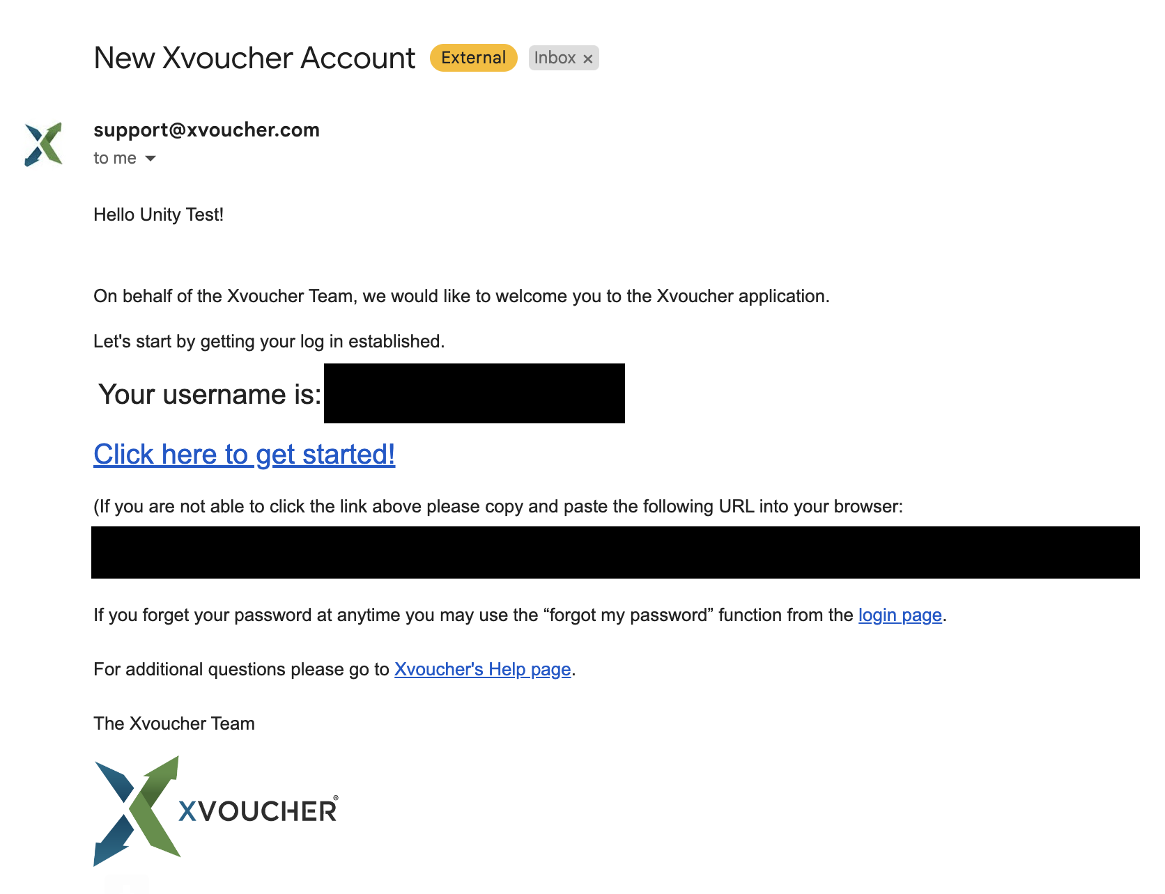This is the welcome email you’ll receive from Xvoucher once your account has been created. Click the "Click here to get started!" link to change your password.