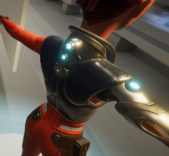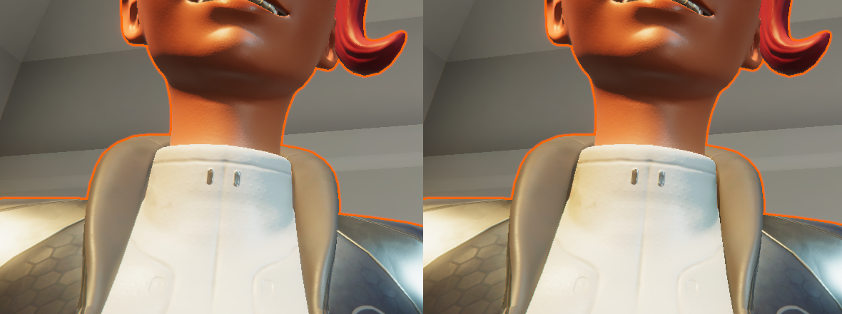 Without the occlusion map, there is no shadow on either side of Ellen’s collar, which makes that area look flat. In fact, without the occlusion map, it looks like there is light coming from behind her neck at close range. With the additional shadows, the collar looks rounder and the shadow gives the appearance that her collar and vest are two different objects (even though on this model they are one).