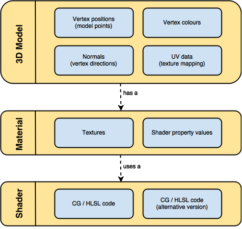 The diagram below loosely represents the three different entities which plays a role in the rendering workflow of Unity: