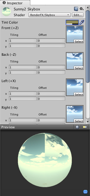 The skybox itself is actually a type of material using one of the shaders from the RenderFX submenu. If you choose the Skybox shader, you will see an inspector like the following, with six samplers for the textures:-