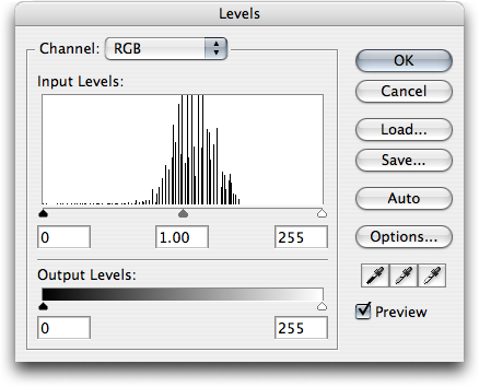 If the detail image has an average brightness greater or lower than 128, the whole image will appear to be lightened or darkened as the camera gets close, which gives the wrong effect. It is therefore important to make sure that the brightness levels in the image are roughly symmetrical around 128. You can check this is the case in most image editing software by looking at the image histogram or the Levels adjustment (which typically also shows the histogram). If the histogram shows a symmetrical "bulge" that is slightly to the left or right of the centre, you can bracket the bulge with the min/max input level arrows to get the brightness centred on 127.