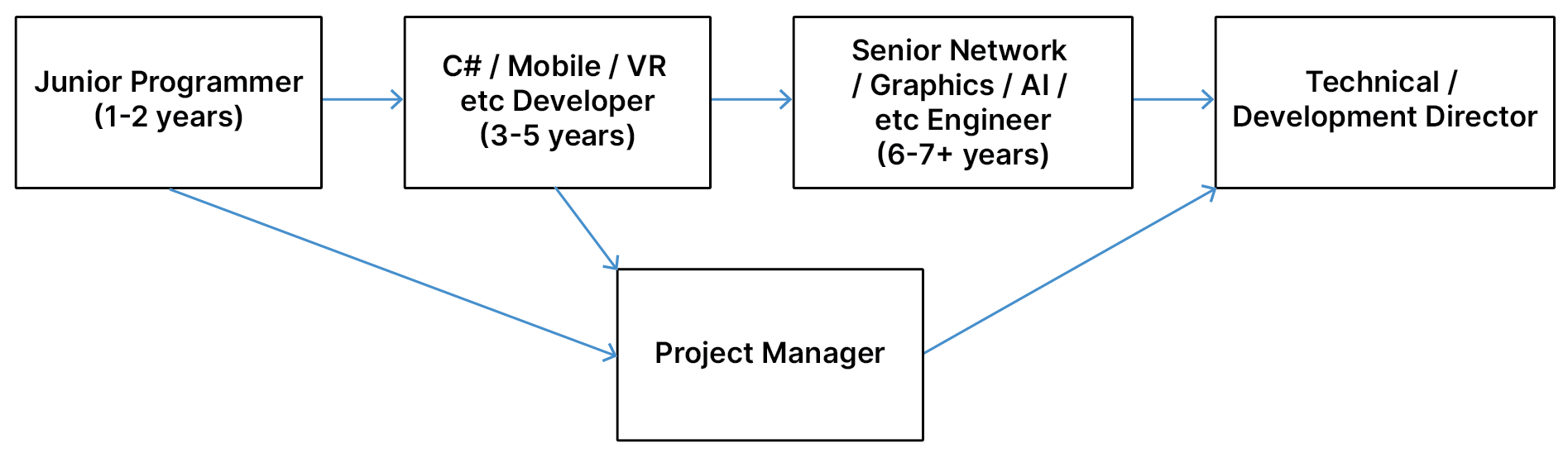 Professionals in Programming roles tend to begin as junior programmers or analysts. They might specialize in a particular platform (e.g., mobile developer) or discipline (e.g., network engineer) as they gain more experience. They may eventually find opportunities to become technical or development directors. People who begin in development can also pursue careers in product or project management.