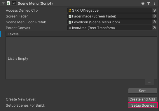 This will configure the menu Scene and its associated levels ready to be built.