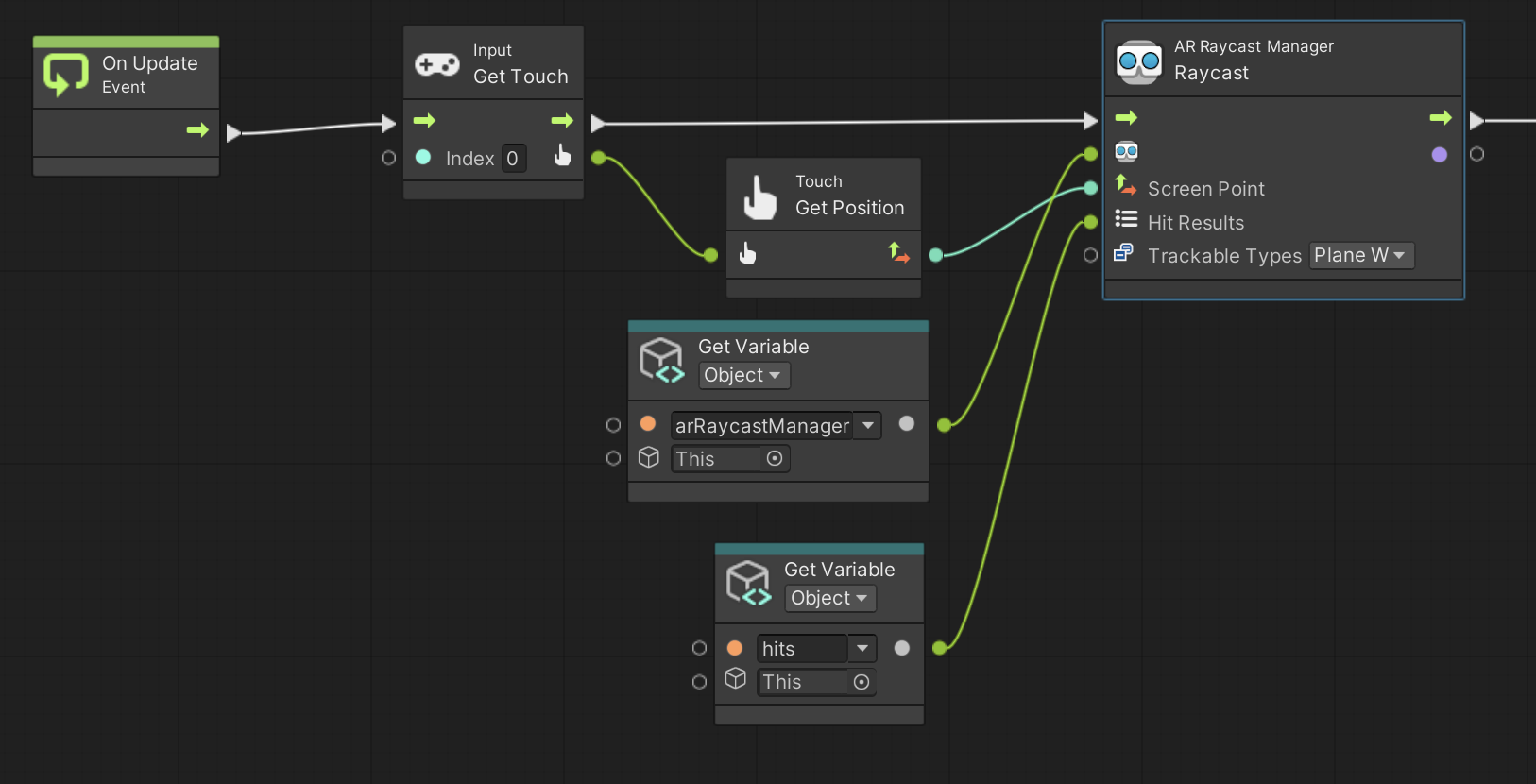 2. 퍼지 파인더를 사용하여 AR Raycast Manager: Raycast (Screen Point, Hit Results, Trackable Types) 노드를 추가합니다.