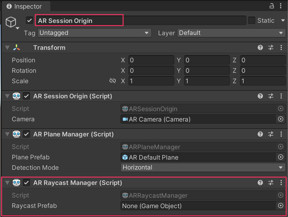 2. 인스펙터에서 새로운 AR Raycast Manager 컴포넌트를 추가합니다.