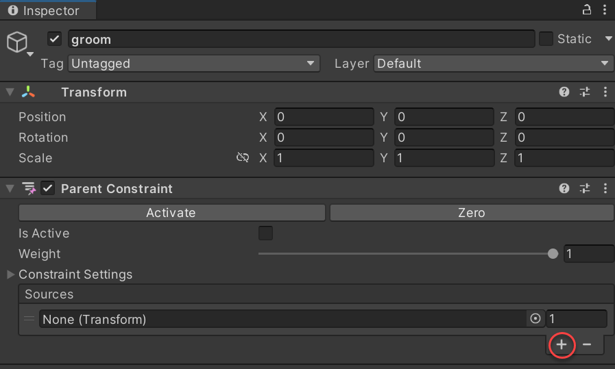 3. Add a Parent Constraint component to the groom GameObject. Select the Add (+) button at the bottom of the component to add to the list of Sources.