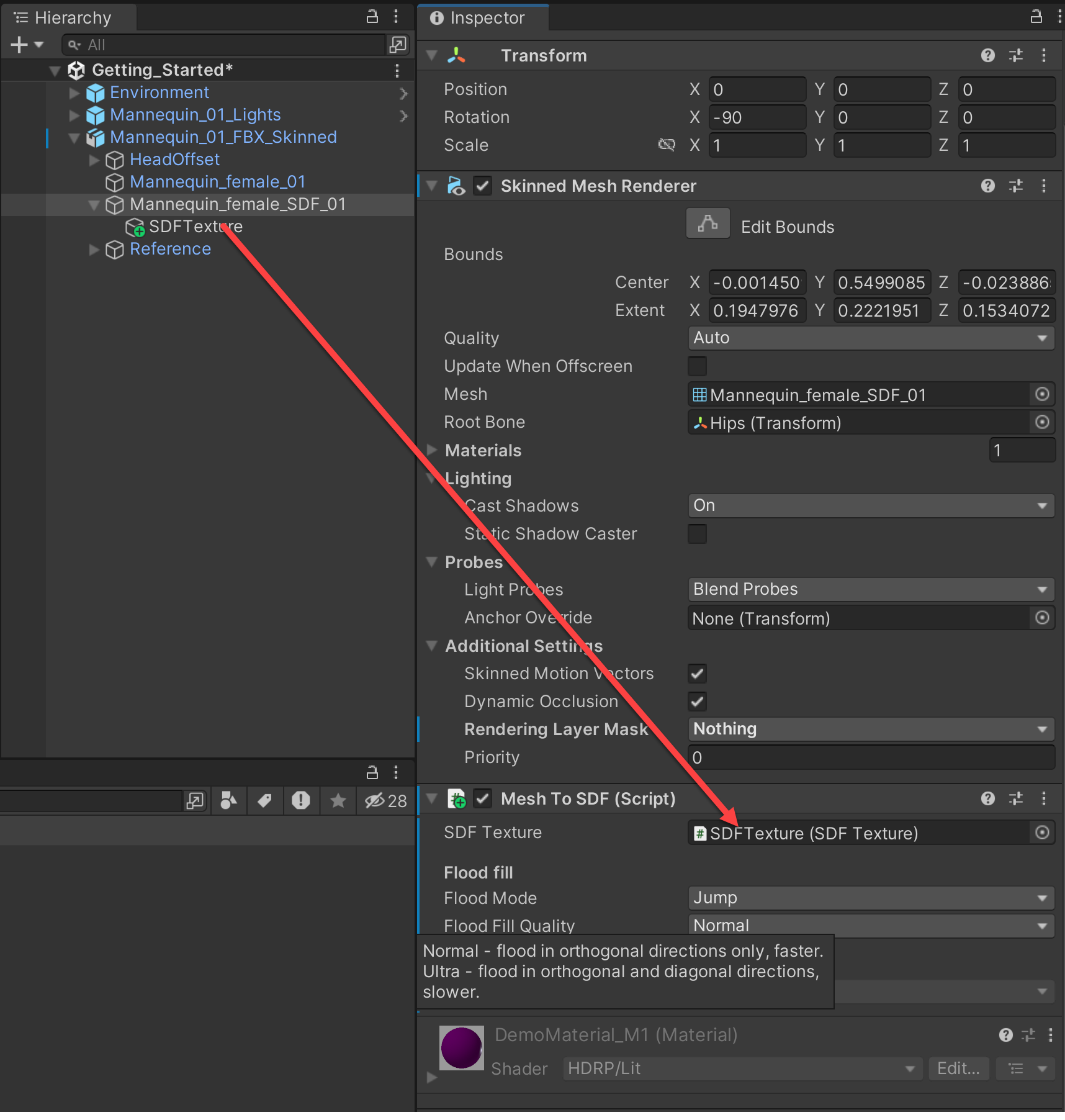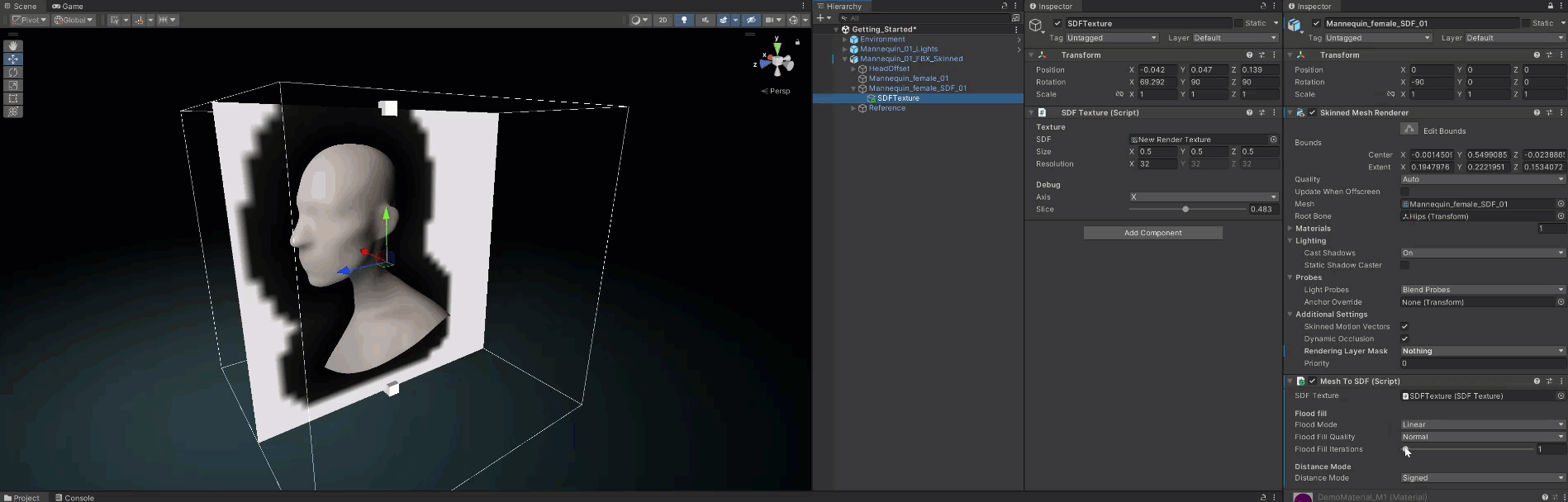 The MeshToSDF component is the actual SDF generator. It looks for a mesh on the same Game Object in either a SkinnedMeshRenderer, MeshRenderer, or MeshFilter, generates an SDF for it in the volume defined by the SDFTexture component, and outputs the SDF into the RenderTexture you created.