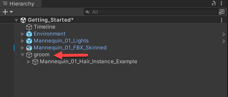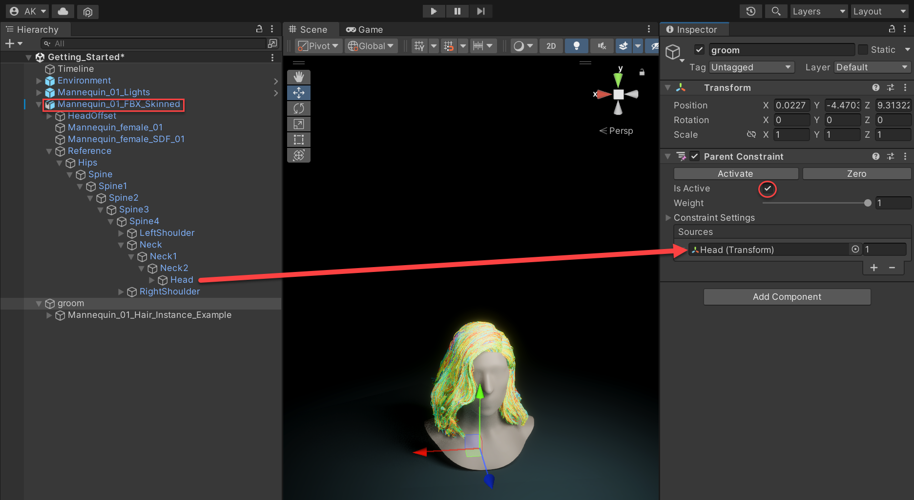 2. Make your Hair Instance GameObject a child of the groom GameObject.