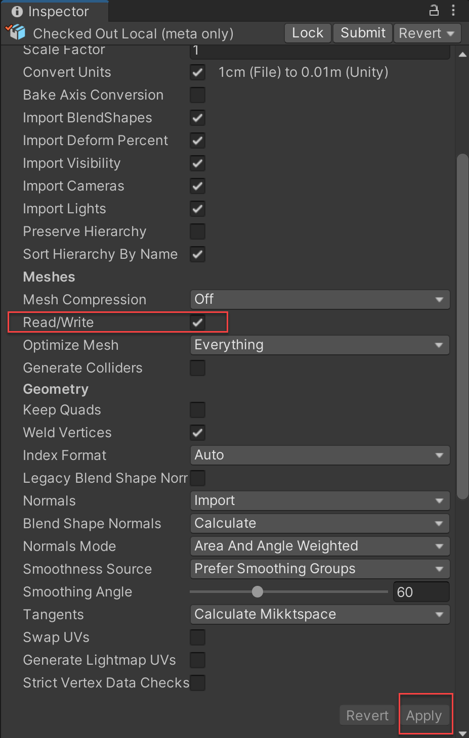2. Select your character mesh and prepare it; enable Read/Write in the Inspector Model tab.