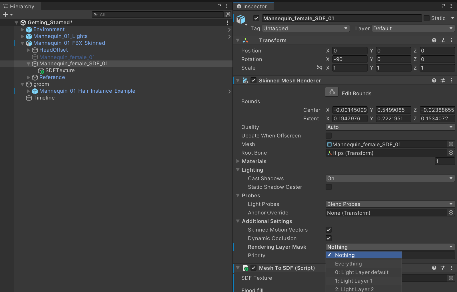Note: If you disable the low poly GameObject, this prevents MeshToSDF from functioning properly. If you disable the renderer, this also disables skinning. Therefore, the above rendering layer adjustment is the best solution.